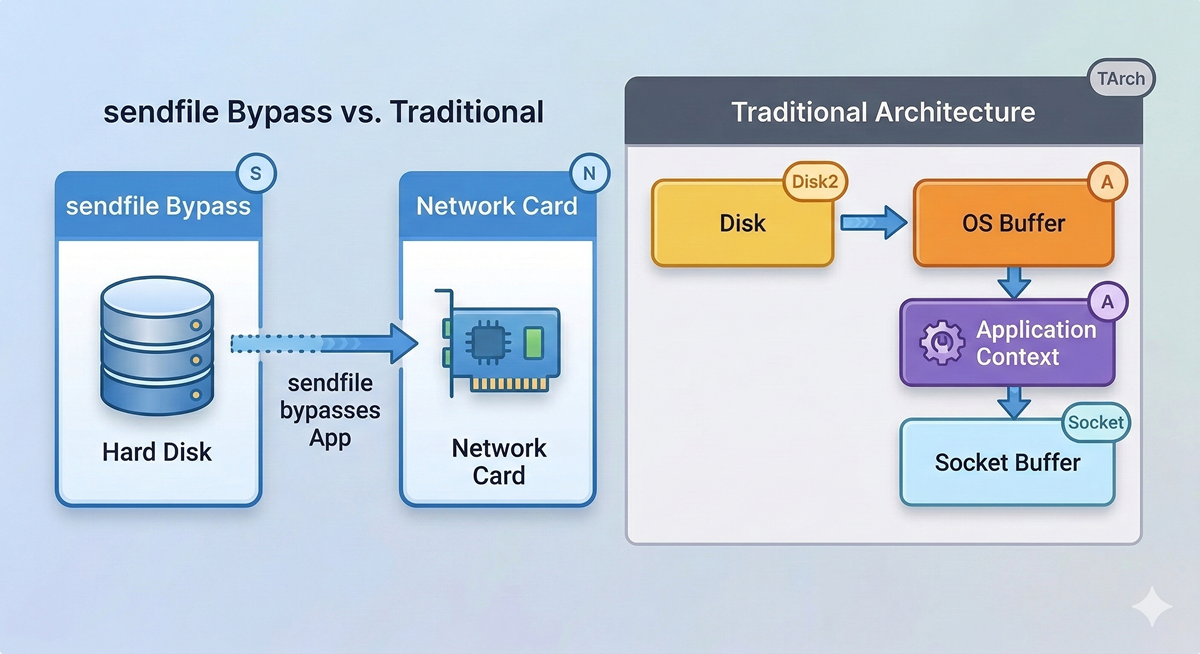 Normally, sending a file over the network is incredibly inefficient. The OS reads the hard drive, copies it to an OS buffer, copies it up to the Java Application, which then copies it back to the OS socket buffer to send to the network card. That’s a massive waste of CPU cycles.