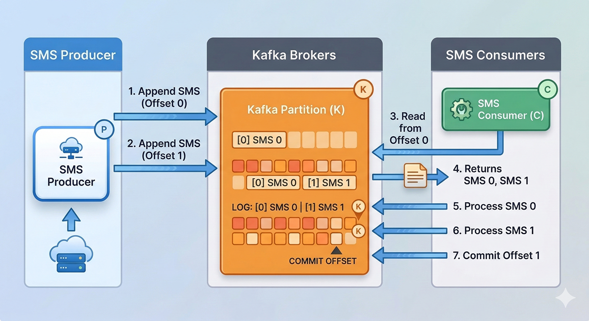 When our Consumer successfully physically sends the SMS, it sends a tiny message back to Kafka saying, “I have successfully completed up to Offset 1.” This is called committing an offset. If the Consumer crashes, a new thread takes its place, asks Kafka for the last committed offset, and flawlessly resumes processing starting exactly at Offset 2.