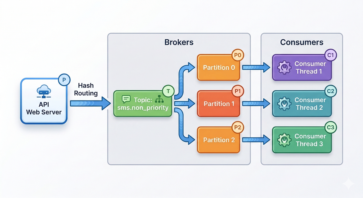 If we configure sms.non_priority to have 3 Partitions, Kafka physically splits the data into three separate append-only logs, often residing on three completely different brokers.