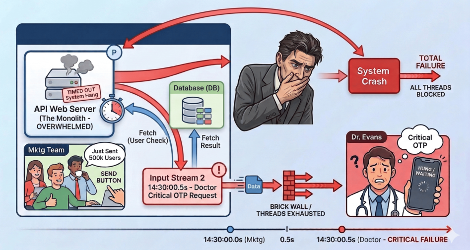 In your monolithic server, a thread loops over the 500,000 users in the database. Think about the sheer weight of that transaction for a moment: fetching thousands of users from the DB, updating their pending statuses, and then synchronously calling an external SMS API over the internet one by one! That is an insane amount of heavy lifting for a single API request. Let’s say, each API call takes half a second, all your server threads instantly become occupied waiting for responses. The doctor’s OTP request hits a brick wall. The system hangs, times out, and crashes.